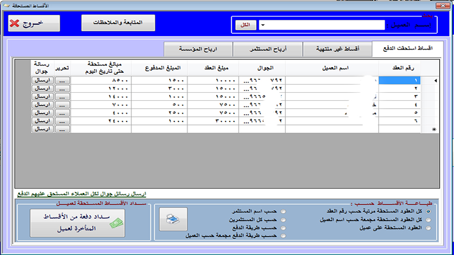 • يمكن تفعيل نظام رسائل الجوال وإرسال رسائل للعملاء باستحقاق المبالغ والمبالغ المتبقية والمبالغ المدفوعة