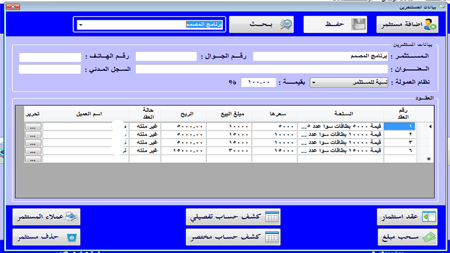 يعتبر برنامج التقسيط من أفضل البرامج في إدارة عقود التقسيط ومتابعتها وتوزيعها على المستثمرين , تضمن للمستخدم دقة في الحسابات وسهولة في الاستخدام والبحث .